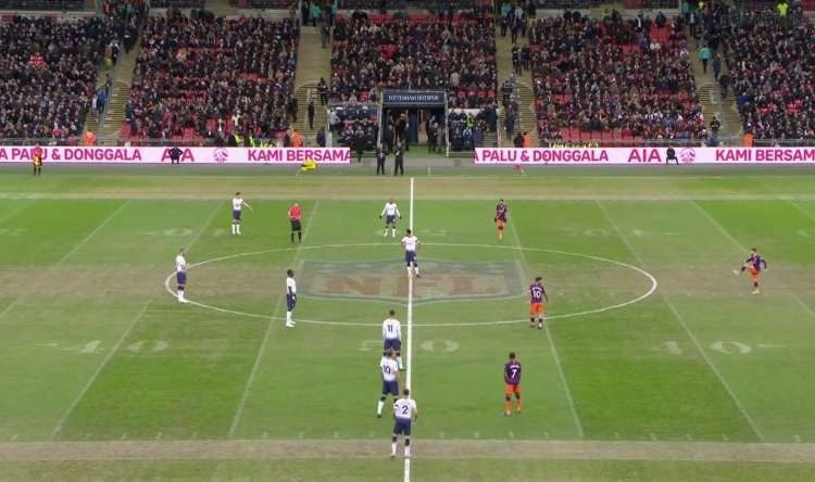 Как видим качество поля оставляет желать лучшего, а в центре поля не успели убрать логотип НФЛ. Стоит отметить, что это не первый раз когда такое случается на «Уэмбли».